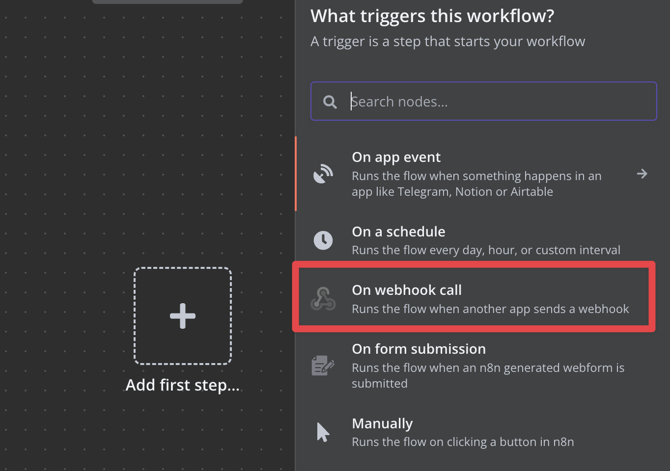 Sur n8n, on va utiliser le déclencheur “on webhook call” :