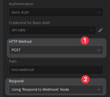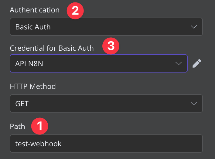 On va personnaliser le Path en “test-webhook” (1) pour simplifier un peu et rajouter une authentification (2-3) :