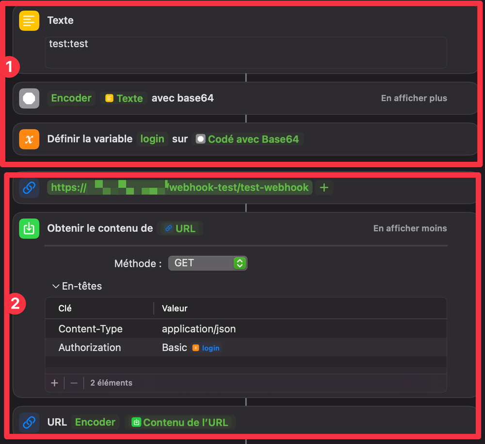 - Je défini ensuite mon url en méthode GET dans mon cas, n’oubliez pas d’adapter le l’url par rapport à votre path. On va ensuite utiliser “obtenir le contenu de l’url” (prendre l’url précédente en variable). Ajouter les 2 clés d’en-têtes (Content-Type : application/json & Authorization : Basic suivi de votre variable login).