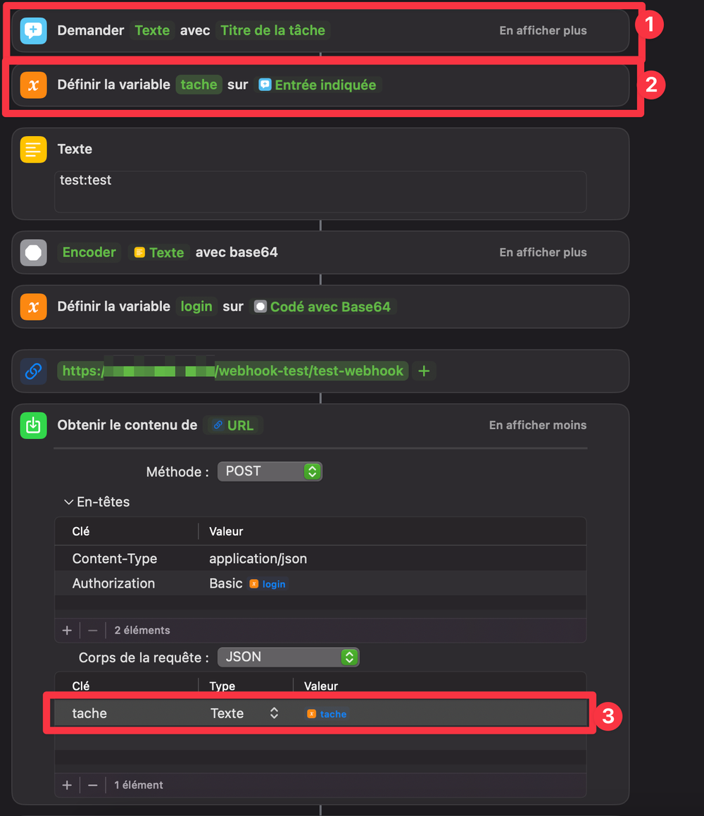 - Dans “obtenir le contenu url”, on va envoyer notre variable “tache” pour la récupérer dans n8n. Passer la requête en “POST” pour pouvoir envoyer de la données et mettre la variable dans le corps de la requête. (3)