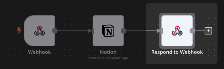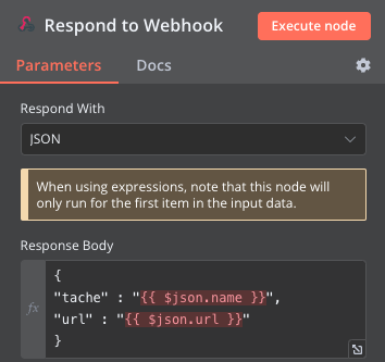 Dans n8n, nous allons donc récupérer l’appel API et les données, ainsi que répondre avec l’url de la tâche Notion crée :
