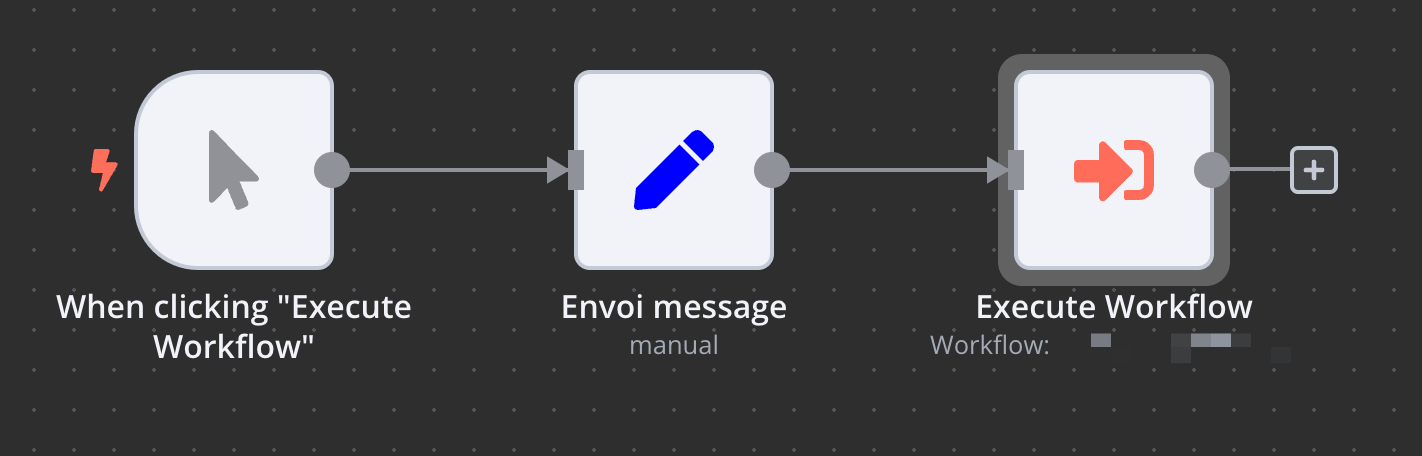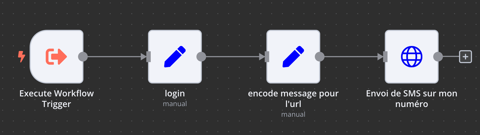 Section intitulée « Utiliser l’API dans n8n »Pour l’exemple, on va créer un workflow qui notifie par sms. On va faire en sorte que ce workflow s’exécute, par le biais d’un autre workflow.