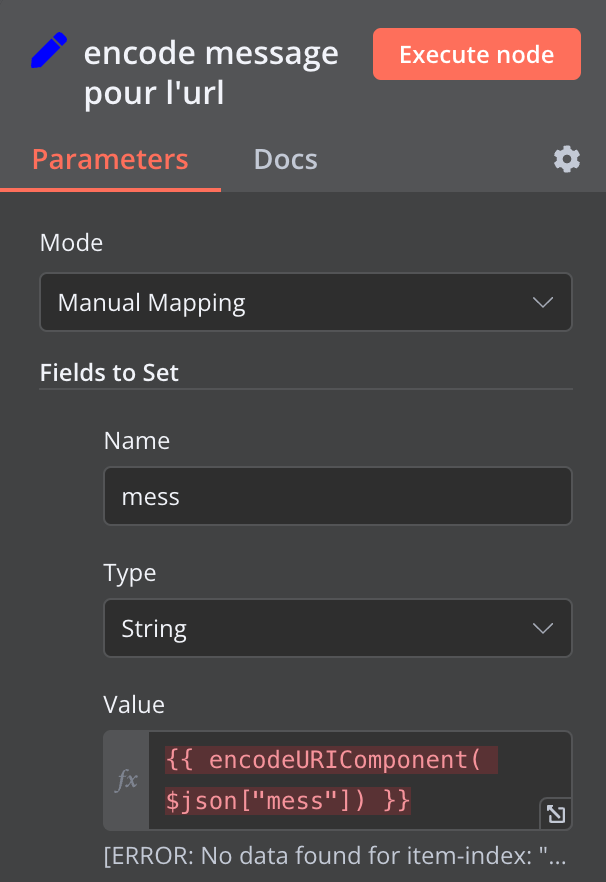 {{ encodeURIComponent( $json["mess"]) }}Ensuite, un node HTTP request :
