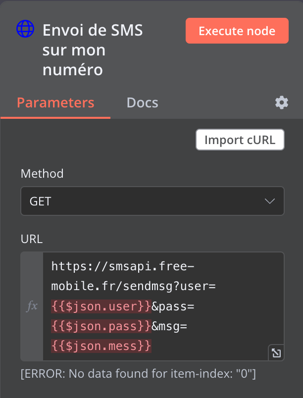 Section intitulée « Pourquoi ne pas définir sous forme de Credential ? »Les variables, user, pass et mess sont directement encoder dans l’url, pour le moment d’après mes recherches, on peut pas créer de Credential n8n pour les mettre directement dans une URL. Si j’ai faux, merci de me le signaler en commentaire 😄.