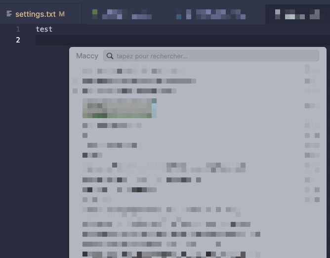Imaginez que vous soyez dans votre éditeur préféré, le raccourci ⇧+Cmd+C permet d’avoir le menu de Maccy à disposition partout :
