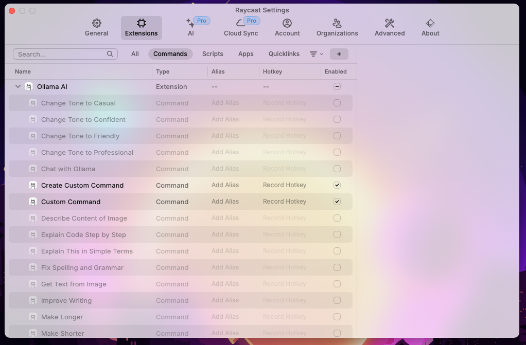 Une fois Ollama et Raycast installé sur votre machine, vous pouvez installer le plugin Ollama sur votre Raycast est avoir accès à des commandes très pratique dans les paramètres :