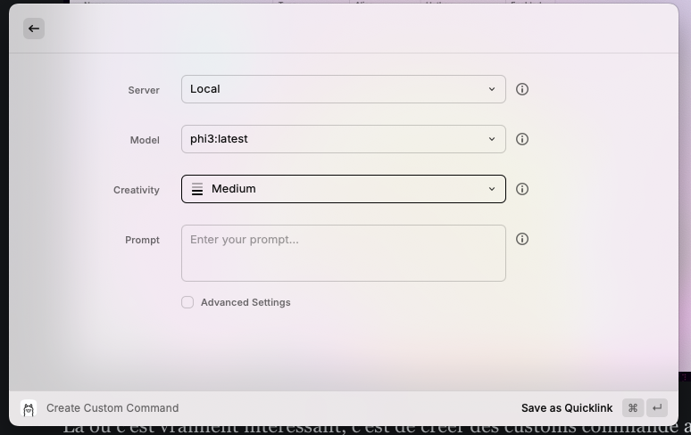 Il est possible en installant ollama d’avoir une IA générative local directement dans Raycast avec des prompt préparer :