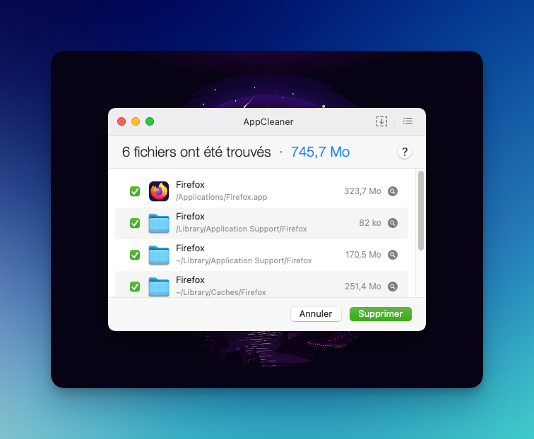 Simple, déposez une application sur la fenêtre d’AppCleaner. Elle va trouver les fichiers liés et vous permettre de les supprimer en cliquant sur le bouton Suppression.