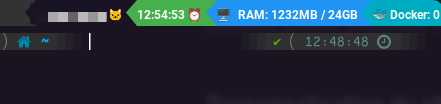 Section intitulée « Personnalisation du statut et des informations en temps réel »L’un des aspects que j’ai également travaillé dans cette configuration est l’ajout d’un statut personnalisé en bas à droite. Celui-ci affiche plusieurs informations essentielles, telles que l’heure, l’utilisation de la RAM et le nombre de conteneurs Docker actifs :
