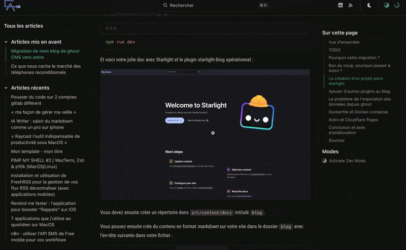 En tout cas, on peut dire que cette migration m’a beaucoup appris sur Astro.js et Astro-Starlight. C’est un super outil de documentation que l’on peut transformer en blog avec un plugin. J’ai ainsi obtenu un site léger et statique, tout en étant ergonomique et pas trop moche.