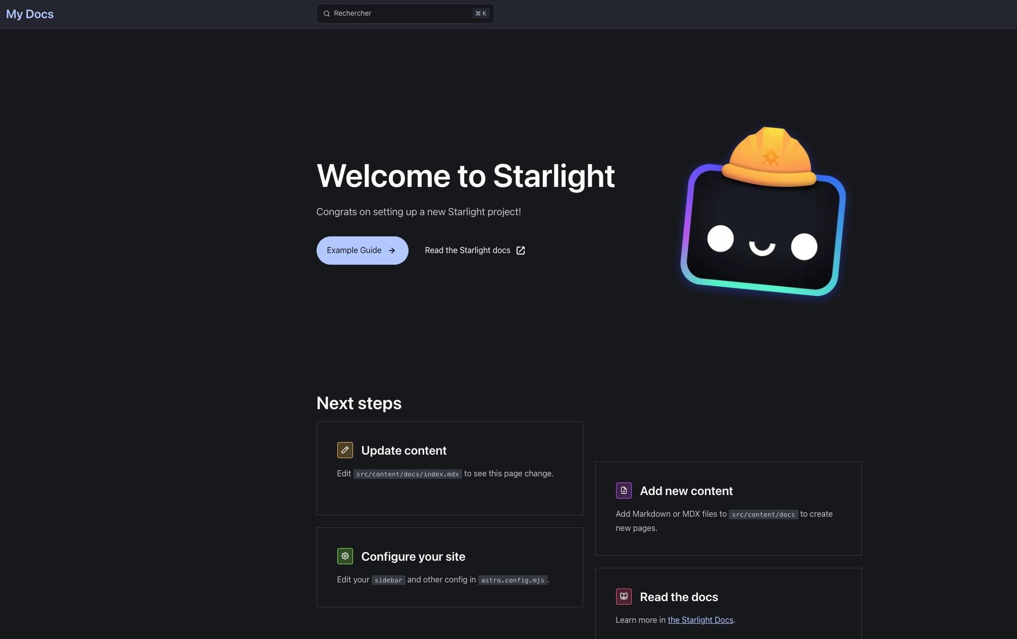 // https://Astro.build/configexport default defineConfig({ integrations: [ starlight({ plugins: [ starlightBlog({ authors: { Bob: { name: "Antoine CALLOT", title: "Couteau suisse IT", picture: "/assets/antoine-callot.jpeg", }, }, postCount: 12, frontmatter: { prev: false, next: false, }, }), ], title: "My Docs", social: { github: "https://github.com/withAstro/starlight", }, defaultLocale: "root", pagination: true, // optional locales: { root: { label: "French", lang: "fr-FR", // lang is required for root locales }, }, sidebar: [ { label: "Guides", items: [ // Each item here is one entry in the navigation menu. { label: "Example Guide", slug: "guides/example" }, ], }, { label: "Reference", autogenerate: { directory: "reference" }, }, ], }), ],});Vous pouvez run le projet :