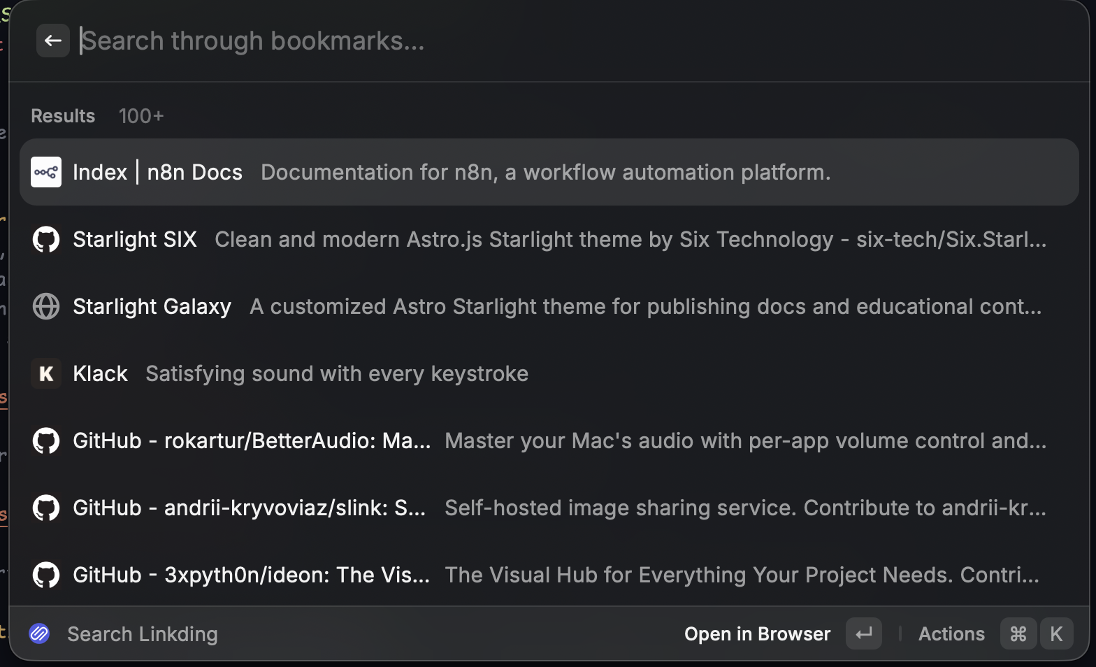 Section intitulée « Les outils que j’utilise avec Linkding »C’est là que ça devient très intéressant. Avoir un serveur de favoris, c’est bien. Y accéder en 2 secondes, c’est mieux.