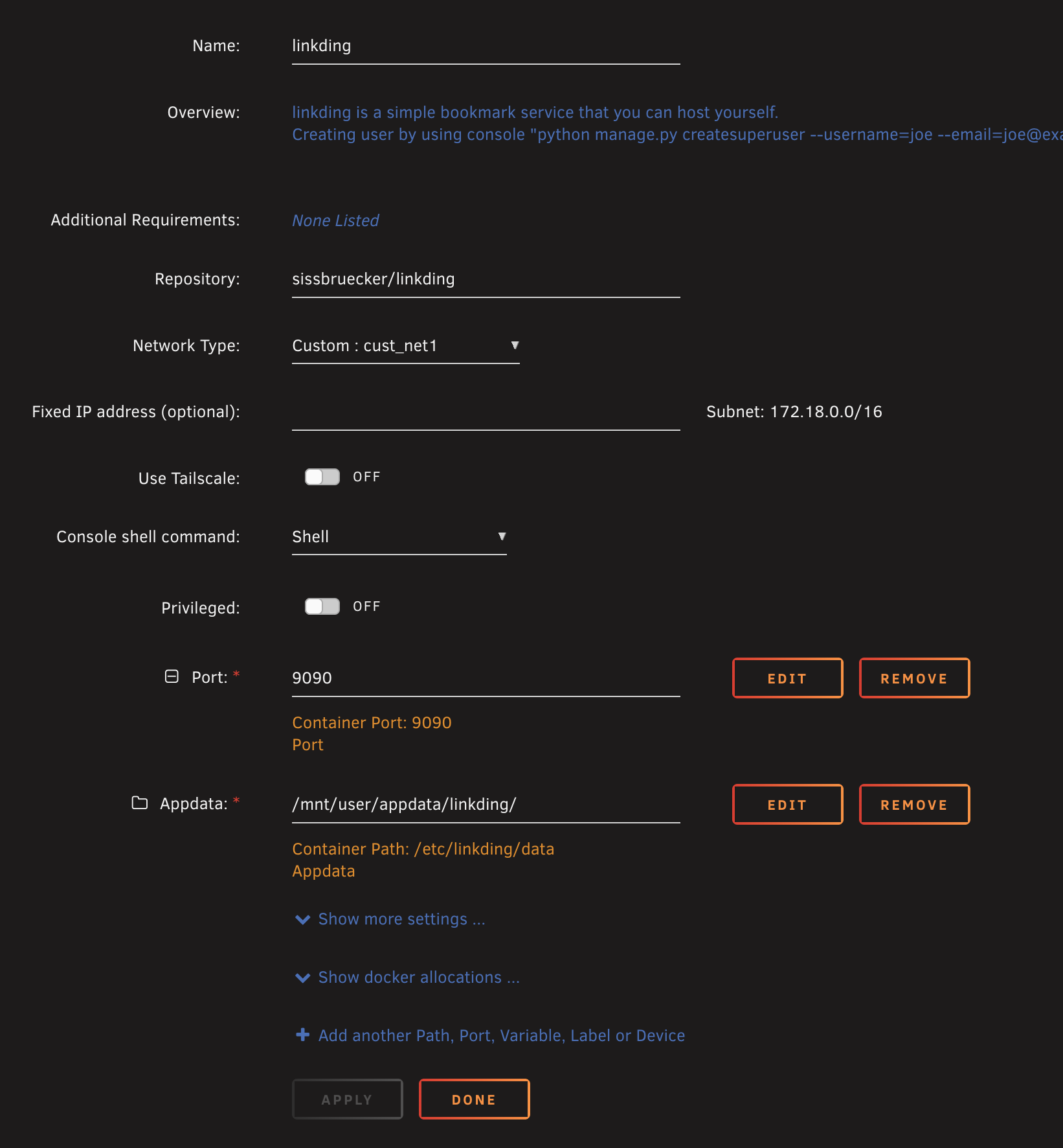 Section intitulée « Installation via Docker »Convaincu ? Alors, on va déployer Linkding sur notre serveur. C’est un conteneur très léger qui utilise SQLite par défaut (parfait pour nos petits serveurs).