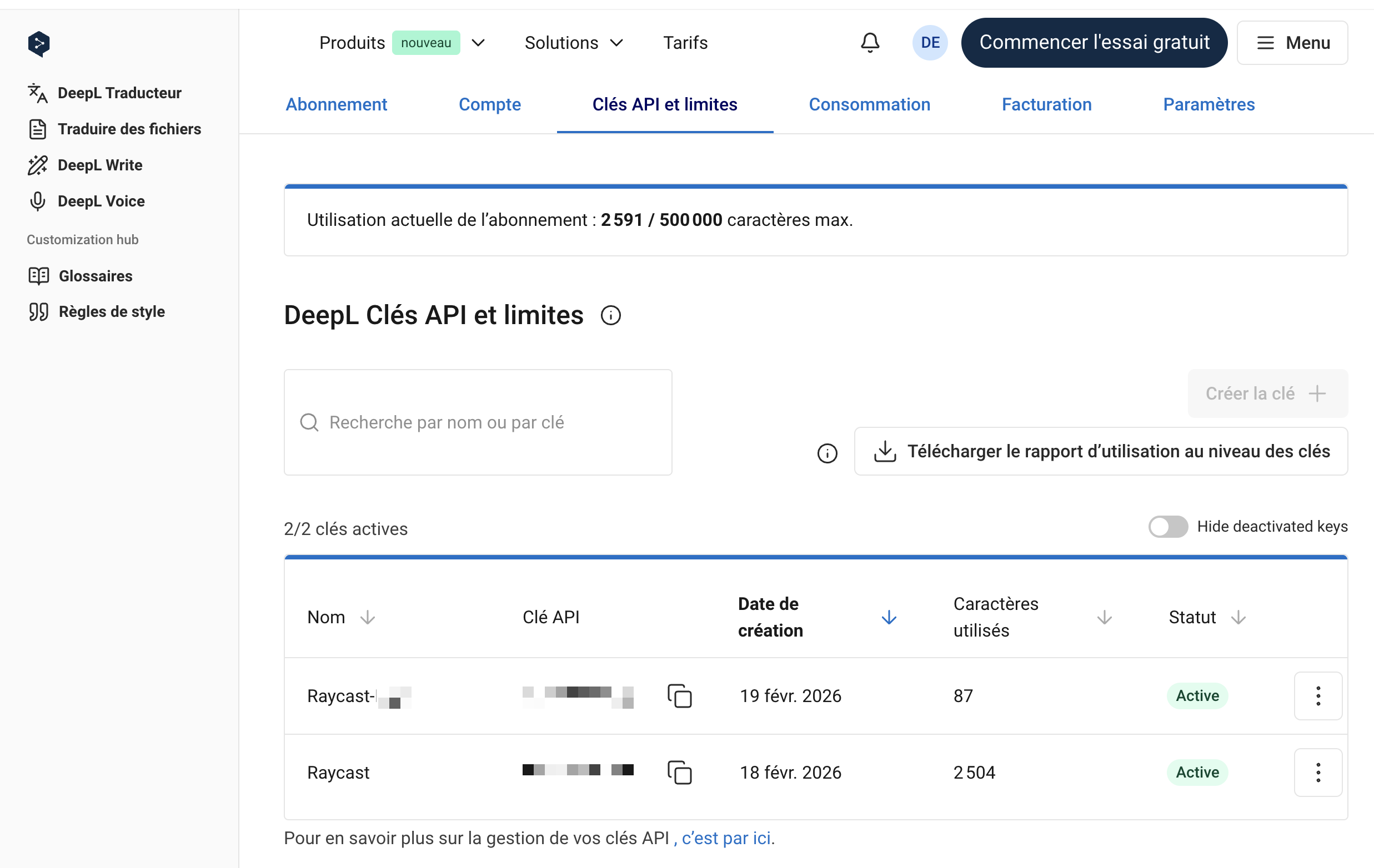 Vous pouvez suivre votre consommation de l’API via votre compte DeepL.
