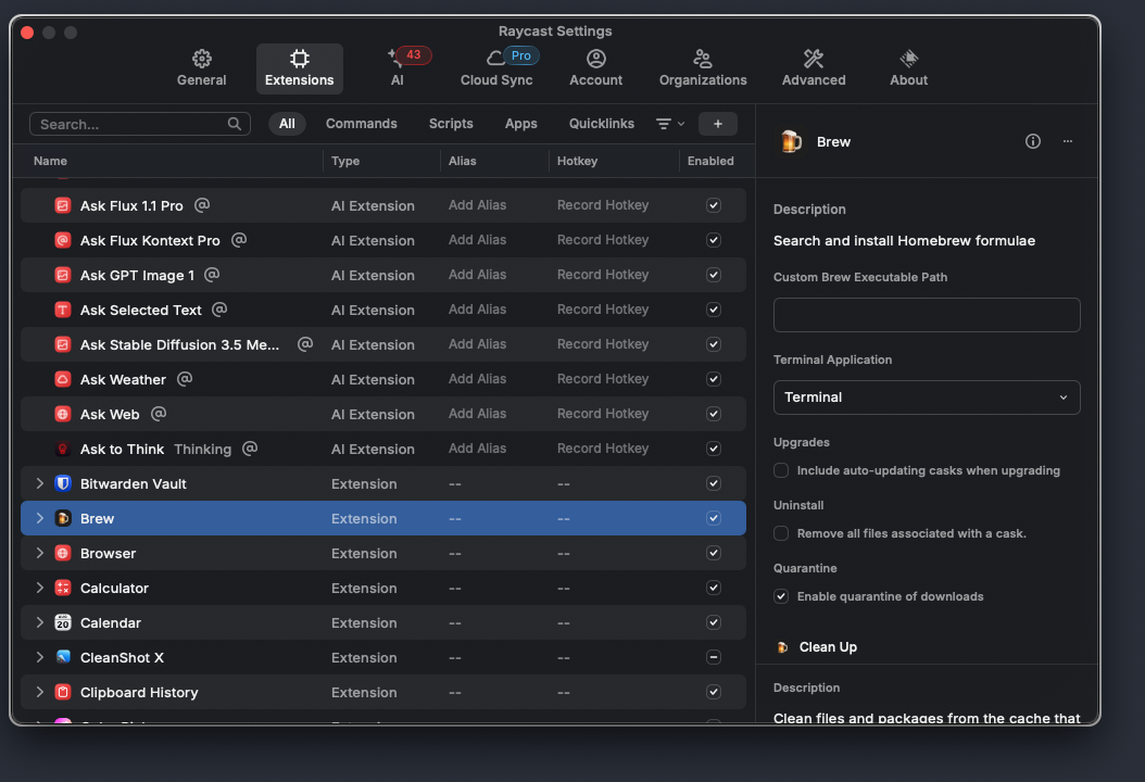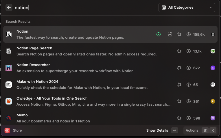 Section intitulée « Introduction »Voici en vrac les listes des extensions que j’ai installées dans Raycast par catégories.