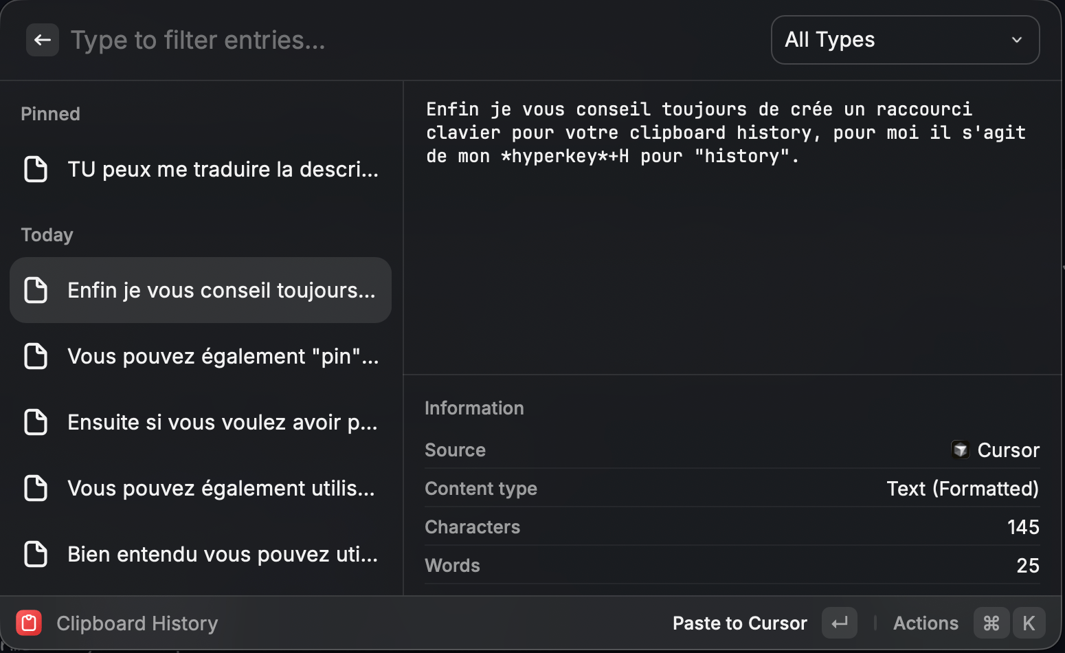 Section intitulée « Conclusion »Vous l’aurez compris, le clipboard history permet non seulement d’avoir, comme son nom l’indique, un historique de presse-papier, mais également d’avoir accès à une palette de commande