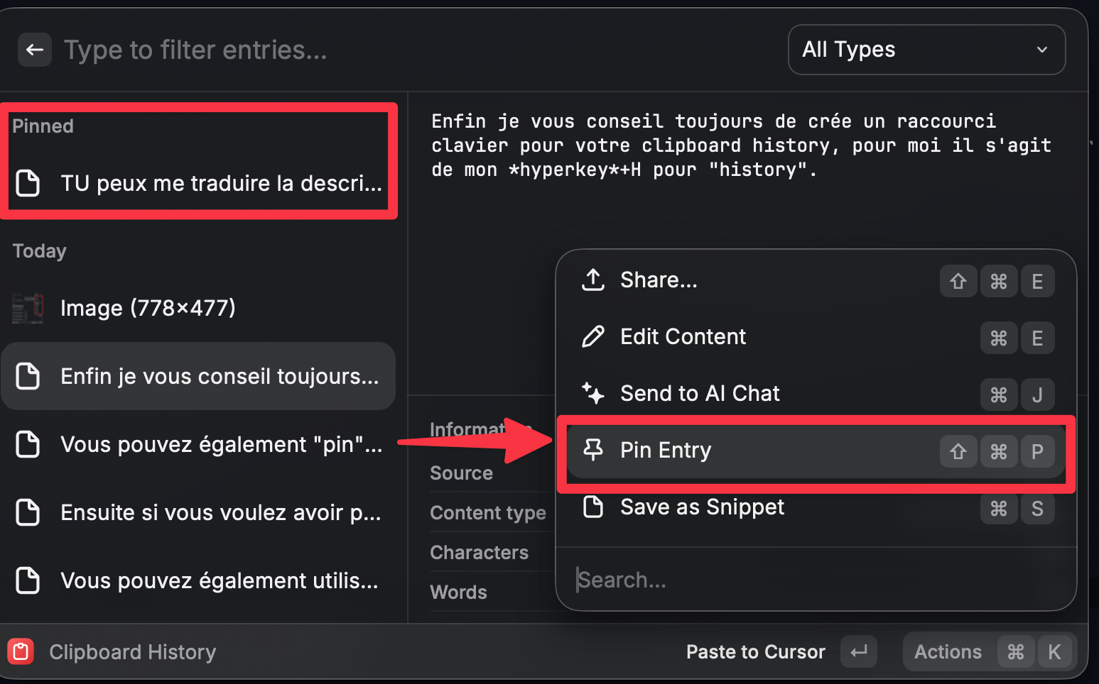 Vous pouvez également “pin” (épingler) une entrée, ce qui vous permet de garder facilement un élément à portée de main.